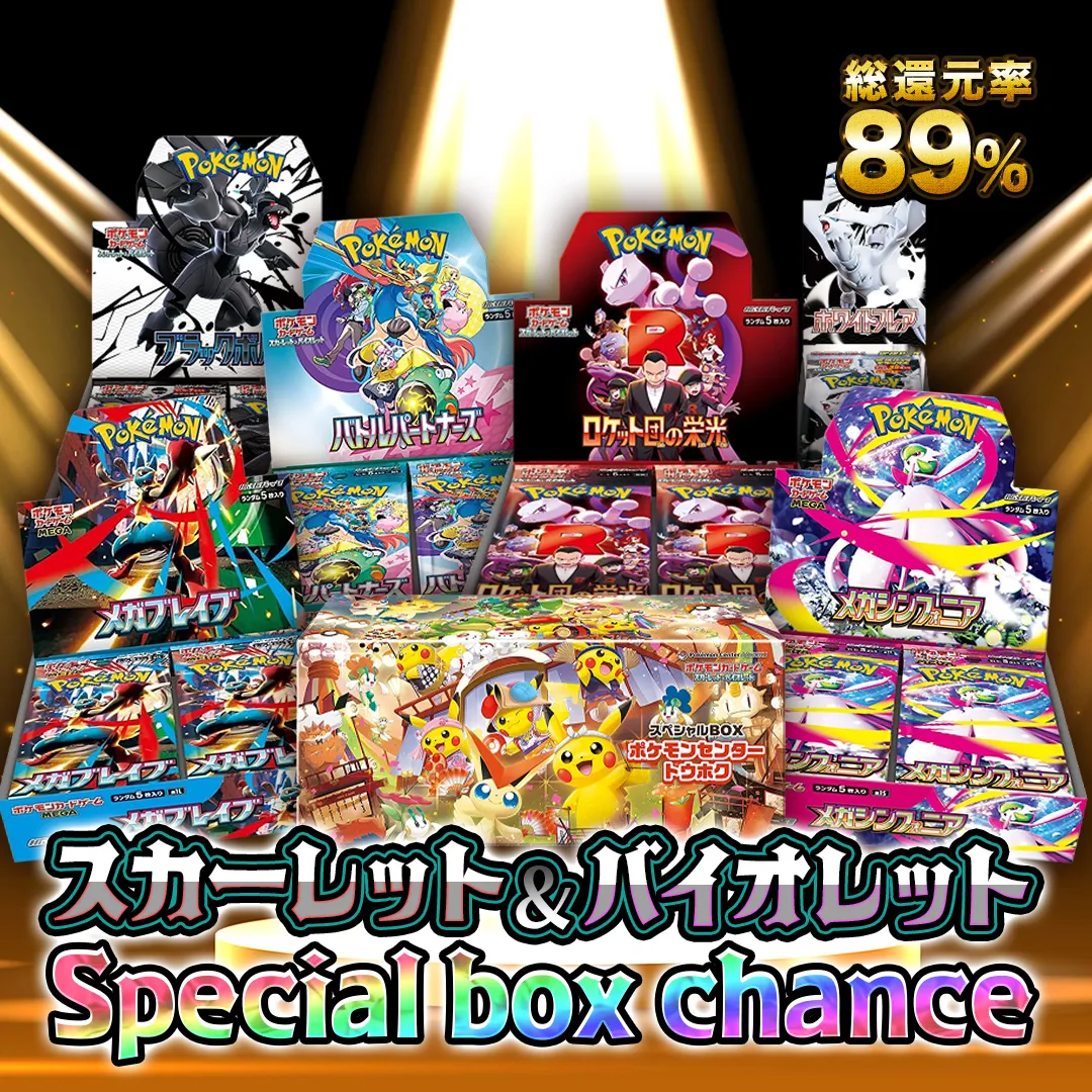 オリパには、キズや汚れのあるカードが含まれる場合がございます。商品画像はあくまでイメージであり、実際に排出されるカードの状態や内容を保証するものではありません。また、掲載されていないカードが排出される可能性もございます。 未開封品に関しましても、外装に軽微な傷や凹み、シュリンクの小さな破れ、シール跡などが発生している場合がございます。未開封パックは梱包の状態により外袋に跡が入ることがあります。当社では、すべての商品について入念な検品を行っておりますが、トラブル防止のため、すべてのお客様に「商品到着時から開封完了までの動画撮影」をお願いしております。撮影の際は、梱包材を含むすべての内容物が画面内に映るようご協力ください。 表示されている還元率は、くじを全口購入された場合の理論値に基づいて算出しております。ただし、実際に獲得されるポイント数は抽選ごとにランダムであり、1口あたり同一額の付与を保証するものではありません。また、サービスの仕様上、商品の交換・返金は承っておりません。 排出確率は、販売開始時点における理論値を表示しておりますが、実際の確率は購入時点の封入状況により変動する場合がございます。そのため、表示されている排出確率を保証するものではございません。 なお、抽選時の演出は、結果の等級や内容を確約するものではありません。 また、販売は予告なく終了する場合がございますので、あらかじめご了承ください。